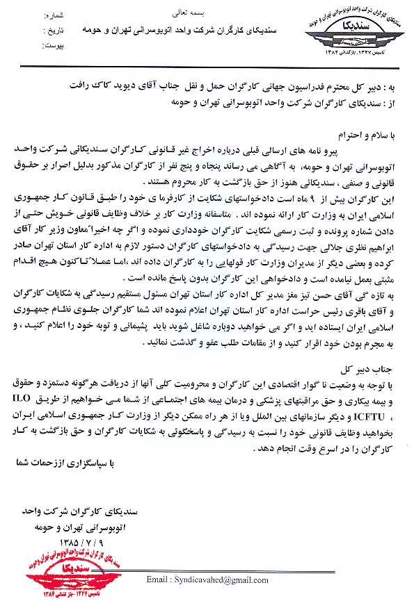 محترم فدراسیون جهانی کارگران حمل و نقل، جناب اقای دیوید کاک رافت