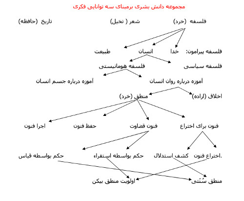 ابتدا ما میخواهیم بدانیم چه ارزشی منطق اصلاً دردرون منطق فلسفه بیکن دارد. آن گونه بیکن درارغنون نوین تقریبا بریک تقسیم بندی مفصل علوم می پردازد. درکتاب پیشرفت علم مهمترین اطلاعات را درآن باره به ما میدهد چه جایی را منطق بطورکُلی دردرون منطق بشری اشغال میکند در پیشرفت علم بیکن ابتدا دانش بشری را مجموعاً تجزیه و تحلیل میکند و هرکدام رابه سه توانایی فکری یعنی برحافظه ؛ تخیل و خرد و درادامه درسه زمینه تاریخ؛ شعر و فلسفه تقسیم میکند.