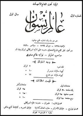معرفی نشریۀ عالم نسوان: نشریۀ عالم نسوان به صاحبامتیازی ربابه نوابه صفوی و مدیریت داخلی عباس آرینپور کاشانی[2] و زیرنظر جمعیت فارغالتحصیلی مدرسۀ بیتآل در تهران تأسیس و شمارۀ اول آن در سال 1299ش/ 1920م منتشر شد.[3] این نشریۀ علمیاخلاقی[4] هر دو ماه یکبار در چهل صفحه در قطع خشتی کوچک به چاپ میرسید؛ بنابراین، در هر سال شش شماره از آن توزیع میشد.[5] این مجله در سال نهم تعداد صفحات خود را به 48 صفحه افزایش داد.[6] انتشار نشریۀ عالم نسوان دوازده سال و سه ماه ادامه یافت. آخرین شمارۀ آن در سال 1312ش/ 1933م منتشر شد. عالم نسوان در سراسر کشور شعبههایی برای فروش مجله داشت. این نشریه در بمبئی و عراق نیز توزیع میشد.[7]
