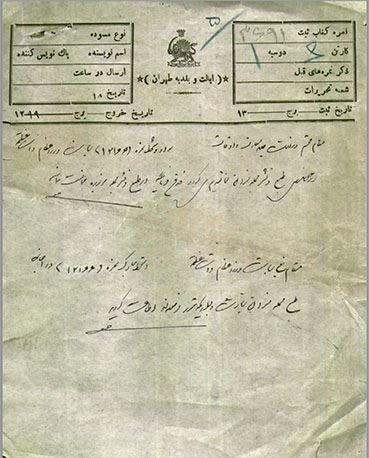 [نشان تاج و شیر و خورشید]، (ایالت و بلدیه طهران)، نمره کتاب ثبت 3691، کارتن6، دوسیه1، تاریخ خروج: 18 برج ]؟[1299