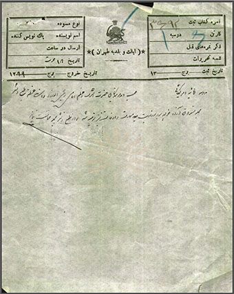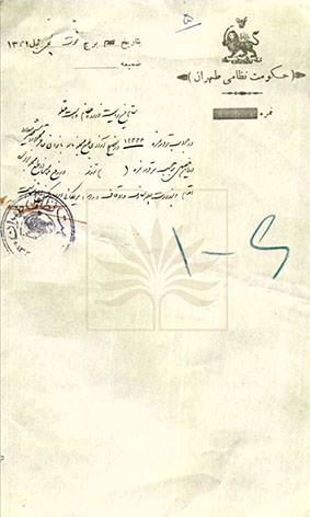 [نشان تاج و شیر و خورشید]، (حکومت نظامی طهران)، کارتن6، دوسیه1، به تاریخ 25برج حوت پیچی (؟) ئیل 1339