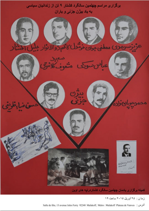 در چهلمین سالگرد این جنایت بی سابقه رژیم شاه، و به دعوت خانواده جزنی و کلانتری، کمیته ای از دوستداران بیژن به منظور برگزاری مراسمی در بزرگداشت یاد و خاطره این عزیزان در پاریس تشکیل شد. این کمیته از هموطنان دعوت می کند که در این مراسم یادمان حضور به هم رسانند. زمان ۲۵ آوریل ۲۰۱۵ ساعت ۱۹ آدرس Salle de fête 13 avenue jules ferry 92240 Malakoff Metro : Malakoff plateau de Vanves ![]() نظر شما؟
