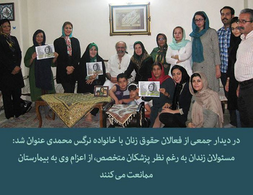 در این دیدار خانواده و فرزندان نرگس محمدی که روز گذشته توانسته بودند با وی ملاقات حضوری داشته باشند در مورد آخرین وضعیت نرگس گفتند: به رغم آن که دو تن از پزشکان متخصصی که نرگس سالهاست زیر نظر آنان به معالجه می پردازد، طی نامه های کتبی به دادستانی اعلام کرده اند که نرگس باید جهت ادامه معالجه در بیرون از زندان بستری شود، اما متأسفانه مسئولان زندان از اعزام وی به بیمارستان سر باز زده اند و اعلام کرده اند که اجازه این کار را نمی دهند. در همین زمینه برادر نرگس محمدی عنوان کرد: من طی هفته گذشته نامه دو تن از پزشکان متخصص نرگس را به دادستانی تحویل داده ام که نظر پزشکی شان آن است که باید نرگس برای ادامه معالجه در بیمارستانی بیرون از زندان بستری شود، حتا پزشک زندان هم با توجه به وضعیت جسمی نرگس به او گفته که باید برای معالجه به بیمارستان اعزام شود ولی به رغم همه این نظرات تخصصی پزشکان، متأسفانه مسئولان زندان از این کار سر باز می زنند و به رغم پیگیری های متعددی که داشتم، تاکنون با این کار موافقت نکرده اند.