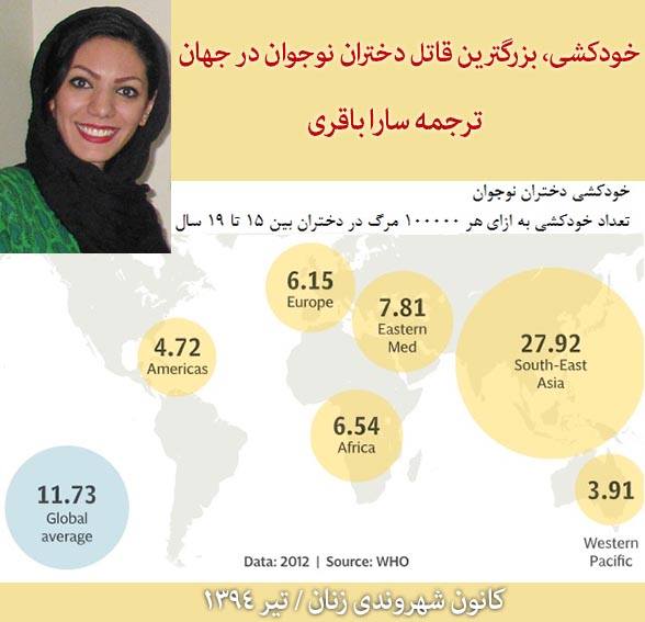 ولی در هر منطقه از جهان، بهجز آفریقا، خودکشی جزو سه دلیل اصلی مرگ دختران بین 15 تا 19 سال است. (در مورد پسران عامل اصلی مرگومیر تصادفات جادهای است). تعجبآور است که چرا این عامل کمتر از میزان واقعی گزارش می¬شود.