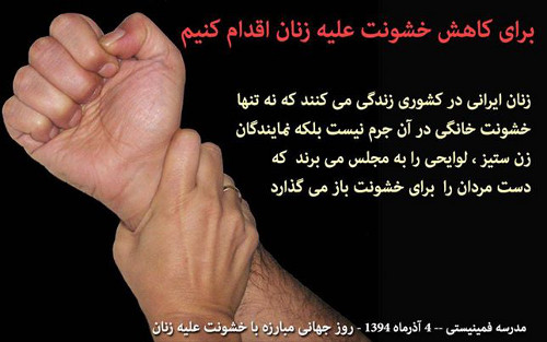 مدرسه فمینیستی: امسال در حالی به استقبال «روز جهانی مبارزه با خشونت علیه زنان» (۴ آذرماه ۱۳۹۴) می رویم که آتش جنگ و خشونت در منطقه زبانه می کشد. نیروهای واپس گرا همچون داعش، در همسایگی ما، با قدرت اسلحه، روش های خشونت آمیز تصاحب قدرت سیاسی را در سطح منطقه دامن می زنند. در این شرایط، زنان بسیار در همسایگی ما با خشونت هایی مواجه شده اند که ابعادش بسیار گسترده و فاجعه آمیز است. از این رو ما در مدرسه فمینیستی به مناسبت روز جهانی مبارزه با خشونت علیه زنان، تلاش خواهیم کرد به ابعاد مختلف خشونت هولناک بر زنان در شرایط کنونی بپردازیم. از سوی دیگر با توجه به نزدیک بودن انتخابات مجلس دهم، بحث خشونت های قانونی علیه زنان را نیز به همین مناسبت پی خواهیم گرفت.