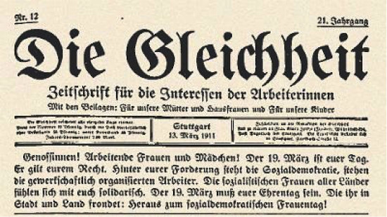 در آلمان دو و نیم میلیون اعلامیه با موضوع مشارکت در روز جهانی زن تهیه و توزیع میشد. اعلان جریده «برابری» پیرامون این روز چنین بود: «رفقا! زنان و دختران کارگر! ۱۹ مارس روز شماست. حق شماست. پشت خواسته شما سوسیال-دموکراسی و کار سازمانیافته قرار دارد. زنان سوسیالیست همه کشورها با شما متحد هستند. ۱۹ مارس باید روز شکوه شما باشد!»