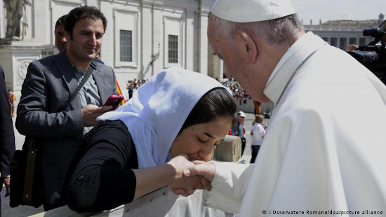 دویچه وله: داعشیها شش برادر و مادرش را جلوی چشمانش کشتند، چون حاضر نشدند دین اسلام را بپذیرند؛ سخن از نادیا مراد، دختری ایزدی، بازمانده خانوادهای است که داعش او را به بردگی گرفت. پاپ از مصائب او شنید و تصمیم گرفت به عراق سفر کند.