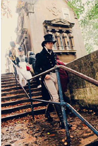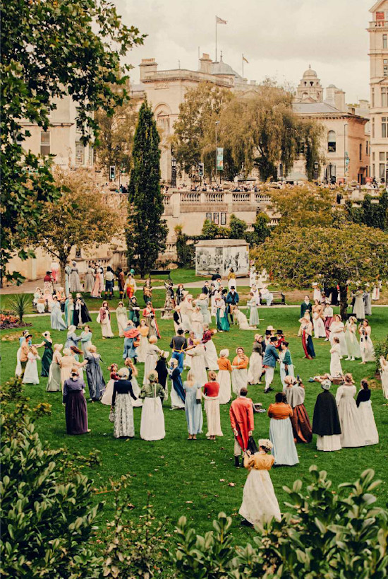 گروه کوچکی مبدل به لباسهای رنگارنگ قرن هجدهمی در حیاط خانهای که جین آستن هشت سال پایانی عمرش را در آن سپری کرد، از یکدیگر عکس میگیرند. این خانهٔ آجری با آجرهای قرمز امروز به موزه تبدیل شده و در چاوتون، دهکدهای کوچک در جنوبغرب انگلستان، قرار دارد. به مناسبت دویستوپنجاهمین سالگرد تولد این نویسنده، برنامهای پر از سخنرانیها، تورهای راهنما و کارگاهها تدارک دیده شده است.