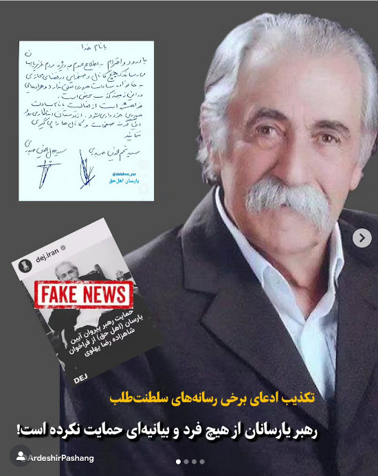 نوشته ای سراسر جعلی با عنوانِ «حمایت رهبر پیروان آیین یارسان( اهل حق) از فراخوان شاهزاده رضا پهلوی»،هم در تلویزیون «ایران اینترناسیونال» خوانده می شود و هم در کیهان لندن چاپ می شود. مرتکب یا مرتکبین این جعل جهت دار، آورده اند«سید نصرالدین حیدری رهبر پیروان آیین یارسان (اهل حق)، طی پیامی که ۱۶ دیماه ۱۴۰۴ در صفحه اینستاگرام وی منتشر شد ضمن قدردانی از مواضع مسئولانه شاهزاده رضا پهلوی در جهت همبستگی ملی و پیگیری خواست عمومی، اعلام کرد که از فراخوان او برای «سر دادن شعار توسط مردم در پنجشنبه و جمعه ۱۸ و ۱۹ دیماه ۱۴۰۴، راس ساعت ۲۰ در خیابانها و یا از منازل»حمایت می کند».