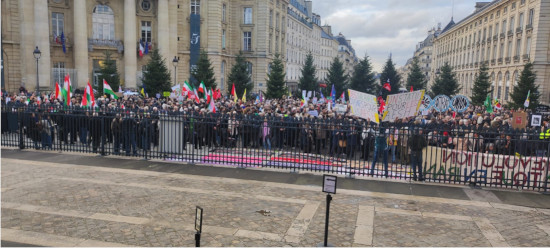 در این تظاهرات چند هزار نفر شرکت داشتند. ترکیب جمعیت متنوع و از أحزاب دموکراتیک و چپ بود. فرانسویان به شکل گسترده ای از احزاب سیاسی تا نهادهای دموکراتیک چپ و آزادیخواه برای همبستگی با مردم ایران در این تظاهرات شرکت کرده بودند. پس از سخنرانی های نماینده انجمن آزادی برای ایران، آیلا نویدی، نماینده انجمن روژا، سمیه، نماینده عدالت برای ایران، شیرین اردکانی و یکی از جوانان رندانی در جمهوری اسلامی که به تازگی به خارج از کشور آمده است: لیلا حسین زاده، راه پیمائی به مقصد میدان ایتالیا که بیش از دو کیلومتر بود آغاز شد.