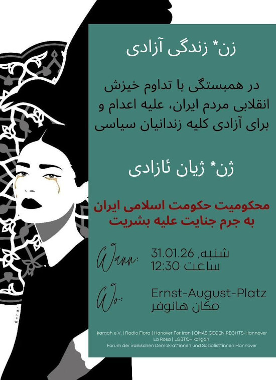 در این برهه از تاریخ مبارزات شکوهمند مردم ایران، که، به نقطه سرنوشتساز خود رسیده ما" کانون کنشگران دموکرات سوسیالیست هانوفر " دراکسیون روز شنبه ۳۱ ژانویه ۲۰۲۶ ساعت ۱۲:۳۰ در Ernst-Augustplatz Hannover
