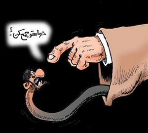 1- البته چند هفته ای است که نیک آهنگ، کاریکاتور خامنه ای را برای اولین بار کشید. قبلاً از یک دست که از عبا بیرون آمده بود به عنوان سمبل خامنه ای استفاده می کرد. علت آن را هم اجازه مرحوم آیت الله منتظری در مورد جایز بودن کشیدن کاریکاتور روحانیون می داند.
