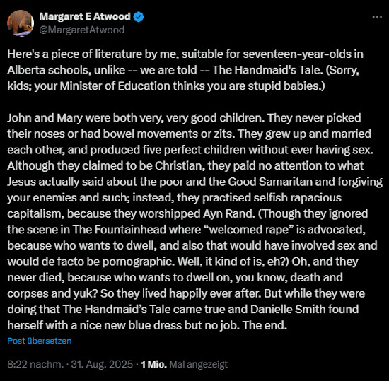 «این قطعهای ادبی از من است، مناسب برای نوجوانان هفدهساله در مدارس آلبرتا ـ بر خلاف «سرگذشت ندیمه» که به ما گفتهاند نامناسب است. (ببخشید بچهها؛ وزیر آموزش شما فکر میکند شما نوزادان کودنی هستید.)