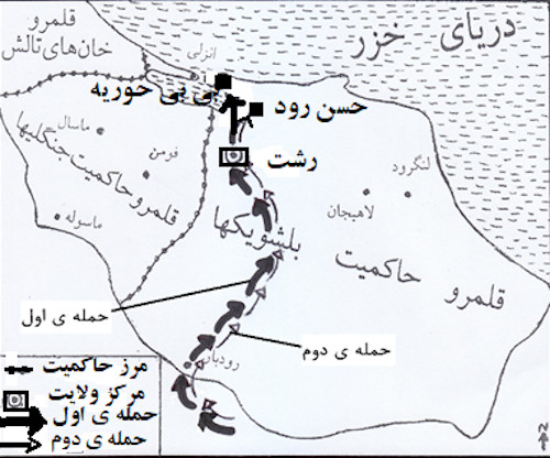 نقشهی ۱ . ۱. مسیرِحملهی اول(۳۰ مرداد) و دوم( اول مهر) قزاقها در سال ۱۲۹۹ خورشیدی به رشت و پیشروی آنان تا «بی بیحوریه و «حسن رود». در این نقشه قلمرو حاکمیت جنگلیها در فومنات در زمان حمله قزاقها نیز نشان داده شده است. کوچکخان این زمان پس از کودتایی که علیه دولت او انجام شده بود، در فومنات به سر میبرد و در قلمرو خود تنها ناظر حوادث بود.
