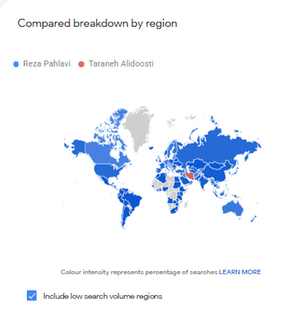 نکته دیگر بنا بر نقشه ایران در نمودار بالا، این که میزان محبوبیت علیدوستی در تمام نقاط ایران بیشتر از رضا پهلوی است، زیرا سراسر نقشه ایران قرمز است. بالعکس، اگر جغرافیای مقایسه از ایران به کل دنیا تغییر داده شود، میزان کنجکاوی در مورد رضا پهلوی در سراسر کشورهای دنیا به جز ایران و صربستان در طی یک ماه گذشته بسیار بیشتر از توجه به علیدوستی بوده است. میزان «محبوبیت» علیدوستی در ایران ۵۶ درصد در مقابل ۴۴ درصد برای رضا پهلوی.