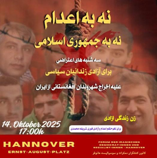 کانون کنشگران دموکرات و سوسیالیست هانوفر همراه با دیگر ایرانیان و افراد مترقی ساکن شهر در اعتراض به حکم اعدام در سهشنبه 14 اکتبر ساعت 17 Ernst-Augustplatz در هانوفر گردهم میآییم و با صدای زندانیان سیاسی همصدا میشویم، و از همه وجدانهای بیدار و متعرض دعوت میکنیم تا سکوت خود را بشکنند و همبستگی خود را با زندانیان سیاسی اعلام نمایند ما با اعتراض خود اعلام میکنیم هیچ نهاد و مقامی حق ندارد زندگی و جان انسانها را بستاند، زندگی حق هر انسانی است.