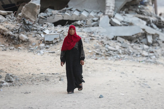 یک زن فلسطینی که از خرابه های جنگی در نوار غزه بازدید می کند