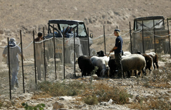 شهرکنشینان اسرائیلی، گلهٔ خود را با حمایت نیروهای نظامی اسرائیل در زمینهای فلسطینی میچرانند. کرانهٔ باختری، ۹ اکتبر ۲۰۲۵.