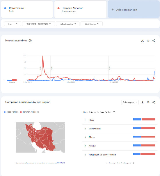 میزان توجه به رضا پهلوی و ترانه علیدوستی ۲۰۲۶-۲۰۱۶ بر اساس کلمات جستجوشده در ایران