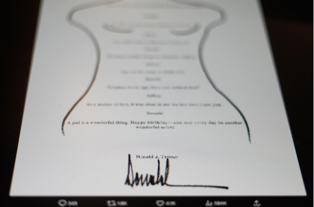 متن با طرحی از پیکر زنی خمیده احاطه شده بود. ترامپ علیه روزنامه والاستریت ژورنال که نخستینبار درباره این نامه گزارش داده بود، شکایتی ۱۰ میلیارد دلاری مطرح کرد.