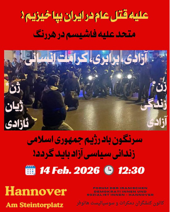 جامعهای ماتمزده در بهت و شوک، در سوگواری خاموش بهسر میبرد. شبح جنگ و مذاکره در فضای یاس و امید پرواز میکند، در حالی که نظام از تأمین مایحتاج روزانه عاجز مانده و گرانی، تورم و بیعدالتی همچنان بیداد میکند. در چنین شرایطی، مردم ماتمزده و خانوادههای جانباختگان از مراسم سوگواری عزیزانشان محروم شدهاند. شناسایی و دستگیریهای گسترده همچنان ادامه دارد و در برخی شهرها خانهگردی برای بازداشت معترضان جریان دارد. تنها بخش کوچکی از اخبار این جنایات فجیع در حال ضبط و ثبت شدن است. آمار جانباختگان، این جانهای شیفته هر روز سیر صعودی دارد و با وجود ایراد فشار به خانوادهها برای علنی نکردن نام کشتهشدگان، هر روز گوشههایی از ابعاد این جنایت سیستماتیک دولتی، برنامهریزیشده و سراسری، نمایان میشود. صحنههای کشتار وسیع دلخراش است: پدر و دختر در آغوش هم جان میدهند، بچه دوساله بر شانههای پدر، دختر در آغوش مادر و هزاران دختر و پسر، پیر و جوان زخمی و مجروح شدهاند. هنوز بر بدنهای بسیاری ساچمه و زخم باقیست و هزاران چشم آسیب دیدهاند. بسیاری از ترس دستگیری به پزشک و بیمارستان مراجعه نمیکنند. پزشکان و کادر درمان همچنان تحت فشار هستند و دستگیری پزشکان، وکلای مردمی، دانشجویان و… در کنار بازداشتهای گسترده ادامه دارد. زندانها با کمبود جا مواجه شده و هنوز پیکر بسیاری از جانباختگان تحویل خانوادهها داده نشده است. گرفتن تعهد، اخذ “پول گلوله” از خانوادهها در ازای تحویل دادن پیکر عزیزشان، ممنوعیت برگزاری مراسم سوگواری و…، از جمله کلیدواژههای ایجاد وحشت است. تا به امروز، به گفته نهادهای حقوق بشری در ایران،۶۹۶۱ نفر از کشتهشدگان احراز هویت شدهاند. بیش از ده هزار نفر در حال بررسی هستند، هزاران نفر مفقود شدهاند و تاکنون قتل دولتی ۱۸۰ دانشجو و ۲۰۰ کودک تأیید شده است. کشتن حتی یک نفر از این افراد نیز مصداق جنایت است. حق اعتراض از مردم گرفته شده و تجربه نشان داده است که جمهوری اسلامی در شرایط بحرانی، شکست، عقبنشینی یا پذیرش “جام زهر”، از زندانیان سیاسی انتقام میگیرد. کشتار بزرگ سال ۶۷ یک نمونهی فراموشنشدنی از این دست بهشمار میرود. سران نظام جنایتکار اعتراض مردم را ادامه جنگ ۱۲روزه و فتنه “اسرائیل و آمریکا“ اعلام کرده و به گفته خودشان بیش از ۲۱۴ نفر از نیروهای نظامی، امنیتی و… را از دست دادهاند. استفاده از دوشکا، کلاشینکف، تکتیراندازان و دیگر سلاحهای جنگی برای خاموش کردن اعتراضات تأیید شدهاند. رژیم ولایی خود بخشی از نیروهایش را که به مردم تیراندازی نکردهاند کشته و به نام “شهید“ ثبت میکند، در حالی که تلاش دارد برخی از کشتهشدگان معترض را بسیجی یا وابسته به نظام جا بزند. این روایتها یکسر وارونه بازنمایی شده و واقعیتهای جاری نشان میدهند که خطر بزرگی برای تعرض به جان زندانیان سیاسی در کمین است، زندانیانی که هر روز بر شمار آن افزوده میشود. زندان، شکنجه و اعدام در کنار اعترافات اجباری میتواند پیشزمینه کشتار زندانیان سیاسی باشد. خواست یک هیئت تحقیق مستقل از وکلا و نهادهای حقوق بشری برای بازدید از زندانهای ایران و تماس با خانوادههای دادخواه، در کنار اینترنت آزاد، میتواند یاریرسان جنبشی باشد که برای نان، آزادی، کرامت انسانی، زندگی و زیست غارتشدهاش مبارزه میکند. مردم دیگر چیزی برای از دست دادن ندارند؛ پس دوباره به پا خواهند خاست و با آموختن از تجربیات جنبشهای قبلی، سازمانیافتهتر و با اتکای به قدرت خویش، متشکل و با عزمی راسخ، بساط رژیم جمهوری اسلامی را بر خواهند چید. برای یاد جانهای شیفته و پر پر شده و در همدردی و همبستگی با خانوادههای دادخواه و در دفاع از دستگيرشدگان شنبه ۱۴ فوریه ساعت ۱۲:۳۰ دگر بار در