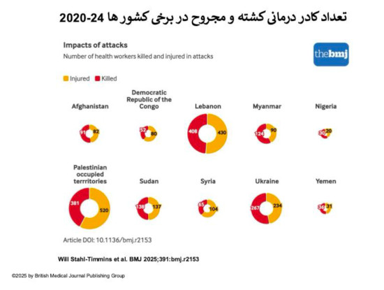 پیکره ۲. مقایسه کادر درمانی کشته (سرخ) و زخمی شده (نارنجی) در سالهای ۲۰۲۰ تا ۲۰۲۴ (پانویس ۶)