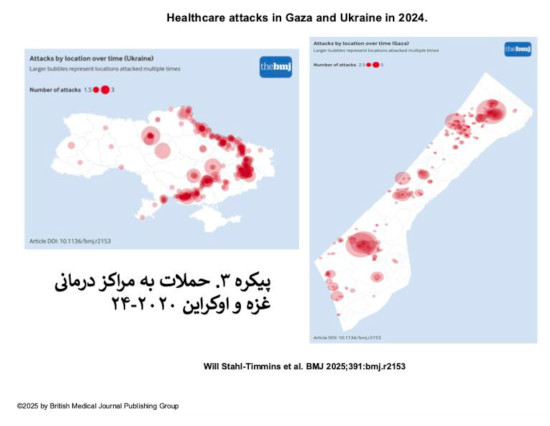 اوجگیری تصاعدی تخریب حوزه درمانی در چند سال گذشته اما، جنایات جنگ داخلی سوریه را بکلی تحت شعاع قرار داده است. نسل کشی رژیم صیهونیستی در نوار غزه و لبنان، حملات هوایی روسیه به اوکراین، و نابودی سیستم پزشکی اقلیت های ملی و مردم شورشی بدست ارتش در جنگ داخلی میانمار به ترتیب در راس جدول جنایات جنگی قرار میگیرند (پیکره ۱ و ۲). باید توجه داشت که نابودی این مراکز نه تنها سیستم درمانی را (آن هم در شرایط جنگی که نیاز ها چند برابر میشوند)، بلکه فراتر از آن کل بافت جامعه را در هم میریزد.