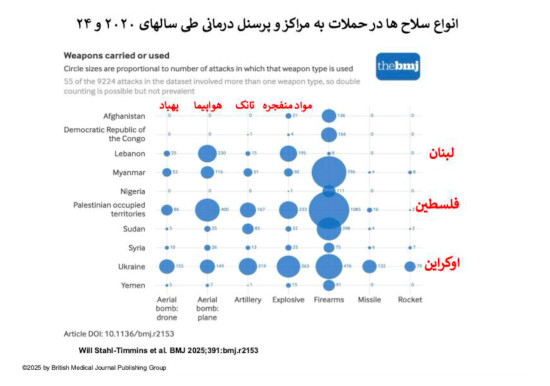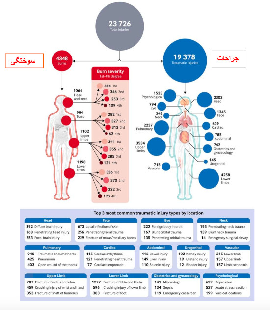 برای هر یک نفر که کشته میشود تعداد بیشتری زخمی میشوند. نوع جراحت رابطه مستقیمی دارد با نوع سلاحی که این جراحت را بر پیکر مجروح وارد میکند. پیکره ۴ انواع سلاح هایی را که کشور های مختلف استفاده کردند نشان میدهد. استفاده از انواع سلاح ها با قدرت انفجاری بالا، بخصوص بمباران هوایی با بمب افکن و پهپاد، نه تنها تلفات بالایی دارند بلکه زخم های مهیبی بر بدن وارد میکنند. پیکره ۵ روشنگر چگونگی ارقام بالای تلفات کادر درمانی است. در این پیکره استفاده بالا از سلاح های انفجاری در حملات به مراکز درمانی در فلسطین اشغالی، لبنان و اوکرایین، و بخصوص در دو کشور اول، کشتار بالا و علت وخامت فاجعه بار انواع جراحت های وارد شده را توضیح میدهد.