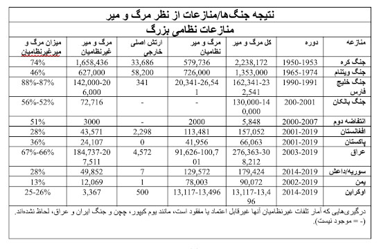 میزان کشتهشدگان غیرنظامی در چند جنگ مهم پس از جنگ دوم جهانی (منبع: خرم منش،۲۰۲۵)