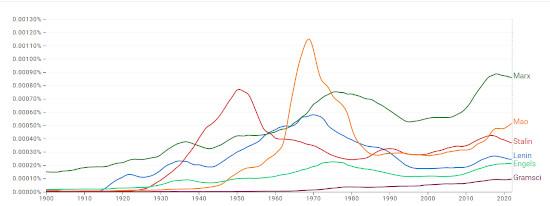 تا قبل از فروپاشی سوسیالیسم واقعاَ موجود، بسیاری از چپگرایان خود را مارکسیست-لنینیست میدانستند. پس از فروپاشی، اگرچه هنوز برخی خود را لنینیست میدانند، اما تعداد آنان قابلمقایسه با گذشته نیست. نمودار زیر بر اساس جستوجو در کتابهای موجود در کتابخانهی گوگلGoogle books ngram viewer تهیه شده است. نمودار نشان میدهد که در بازه زمانی ۱۲۵ سال گذشته چقدر شخصیتهای بزرگ مارکسیسم در کتابهای کتابخانه گوگل مورد توجه قرار گرفتهاند. البته این توجه در برخی از موارد ممکن است منفی باشد. بنا به نمودار، استالین بعد از پیروزی بر فاشیسم در ۱۹۵۰، مائو و لنین در دوران جنبش ۱۹۶۸ محبوبیت زیادی داشتند. پس از آن محبوبیت لنین سیر نزولی پیدا میکند تا این که پس از ۱۹۸۹ دچار یک کاهش ناگهانی شد. در مورد حضور گسترده استالین در کتابها، میتوان حدس زد بخش مهمی از این حضور، قبل از آن که امری مثبت باشد، امری منفی و احتمالا اشاره به دوران وحشت در طول زمامداری او میباشد. اگرچه مائوئیسم در برخی از کشورهای پرجمعیت در آسیا همچنان قوی است، نمیتوان در مورد آن در اینجا تحلیلی داد و نیازی به آن نیز نیست.