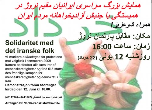 از این رو ما برگزار کنندگان این همایش از شما مردم آزاده دعوت می کنیم در این گردهمایی شرکت کنید تا صدای رسای آزادیخواهانه و برابری طلبانه مردم میهنمان را به گوش جهانیان بویژه مردم آزادیخواه ، صلح طلب و بشر دوست نروژ برسانیم.