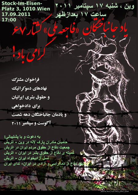 ما اعضای جمعی از نهادهای دموکراتیک ایرانیان در اتریش، به همراه نهادهای دمکراتیک در سراسر جهان، در بیست و سومین سالگرد فاجعه ملی، یک بار دیگر همراه باخانواده های قربانیان، بر پیمان خویش برای دادخواهی جانباختگان دهه شصت و همه جانباختگان راه آزادی و دموکراسی تا روشن شدن حقیقت و محاکمه همه دست اندر کاران این جنایت ها تاکید کرده، از همه ایرانیان و آزادیخواهان در اتریش می خواهیم تا با شرکت در این مراسم یاد همه این جانباختگان را گرامی داشته و در رساندن فریاد داد خواهی و صدای قربانیان و خانواده های آنان به گوش مردم ایران و جهان، با ما همراه شوند.