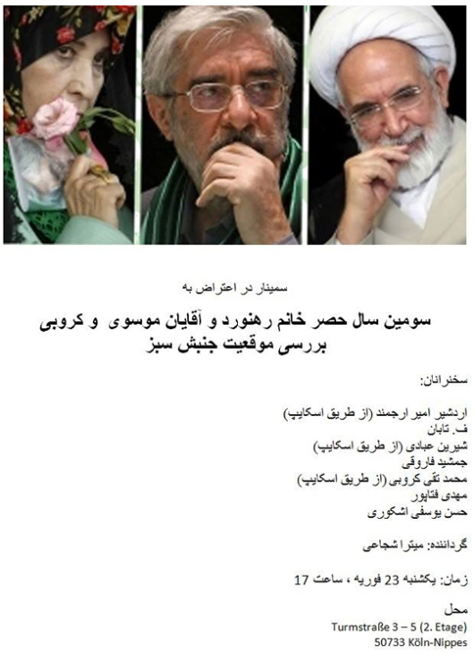 • اردشیر امیرارجمند (اسکایپ) - ف. تابان - شیرین عبادی (اسکایپ) - جمشید فاروقی - محمدتقی کروبی (اسکایپ) - مهدی فتاپور - حسن یوسفی اشکوری. گرداننده: میترا شجاعی - کلن، - زمان: یکشنبه ۲۳ فوریه ، ساعت ۱۷ - کلن - آلمان