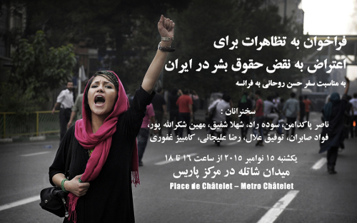 به مناسبت سفر روحانی به فرانسه و با توجه به شرایطِ سرکوب و خفقان در ایران و پایمال شدن فزاینده حقوق شهروندی در کشورمان، جمعی از فعالان سیاسی و مدنی با شعار دموکراسی، حقوق بشر و جدایی دین و دولت در ایران و با خواستهایِ لغو شکنجه و اعدام؛ آزادی زندانیان سیاسی – عقیدتی؛ آزادی اندیشه، بیان، رسانه و تشکّل؛ برابرحقوقی همه شهروندان و پاسخ به دادخواهی خانواده های قربانیان سرکوب در ایران، اقدام به سازماندهی یک تظاهرات برای اعتراض به نقض حقوق بشر در ایران نموده و کلیه هموطنان را به شرکت در این تظاهرات اعتراضی دعوت میکنند.