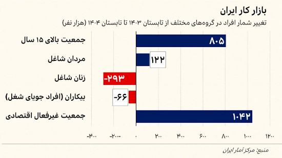 همچنین، ۳۹ میلیون نفر واجد شرایط کار کردن و مسن تر از ۱۵ سال، از کل۶۶ میلیون نفر ایرانی آماده برای کار در بازار کار، شاغل نیستند و در محاسبات نرخ رسمی به عنوان جمعیت غیر فعال اقتصادی تعریف میشوند، اینها کسانی هستند که امیدی برای پیدا کردن شغل ندارند. آمار زنان شاغل در سال ۲۰۱۶ معادل ۱۹٪ و در سال ۲۰۲۴ به ۱۳.۴٪ کاهش یافت. زنان بیکار با درجات علمی دانشگاهی ۷۲٪ در حالیکه بیکاری در مردان با درجات تحصیلی دانشگاه حدود ۴۰٪ است.