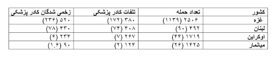 جنگ رژیم صیهونیستی اسراییل در غزه و لبنان آینه ایست برای درک این سیاست جنگی نوین .جدول ۱ مقایسه حملات به بیمارستانها و تلفات نیروهای پزشکی را تا آخر سال ۲۰۲۴ به نقل از نشریه معتبر پزشکی BMJ نشان میدهد. برای قابل مقایسه کردن کشور ها آین ارقام بصورت اعداد بر اساس هر میلیون سکنه نیز در پرانتز ارائه شده:
