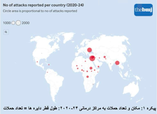 جدول ۱. حملات نظامی به مراکز درمانی و تلفات کادر پزشکی ۲۴- ۲۰۲۰. (پرانتز تعداد در هر میلیون جمعیت) رجوع به پانویس ۶