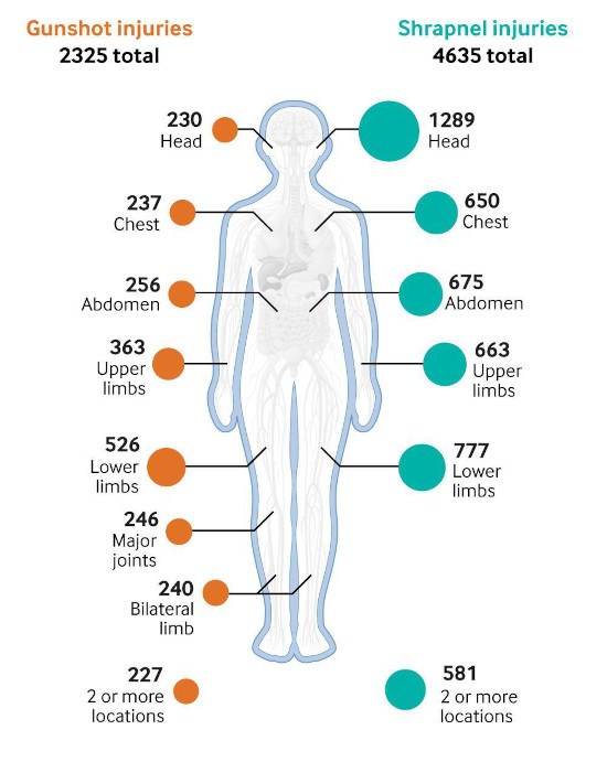برای هر یک نفر که کشته میشود تعداد بیشتری زخمی میشوند. نوع جراحت رابطه مستقیمی دارد با نوع سلاحی که این جراحت را بر پیکر مجروح وارد میکند. پیکره ۴ انواع سلاح هایی را که کشور های مختلف استفاده کردند نشان میدهد. استفاده از انواع سلاح ها با قدرت انفجاری بالا، بخصوص بمباران هوایی با بمب افکن و پهپاد، نه تنها تلفات بالایی دارند بلکه زخم های مهیبی بر بدن وارد میکنند. پیکره ۵ روشنگر چگونگی ارقام بالای تلفات کادر درمانی است. در این پیکره استفاده بالا از سلاح های انفجاری در حملات به مراکز درمانی در فلسطین اشغالی، لبنان و اوکرایین، و بخصوص در دو کشور اول، کشتار بالا و علت وخامت فاجعه بار انواع جراحت های وارد شده را توضیح میدهد.